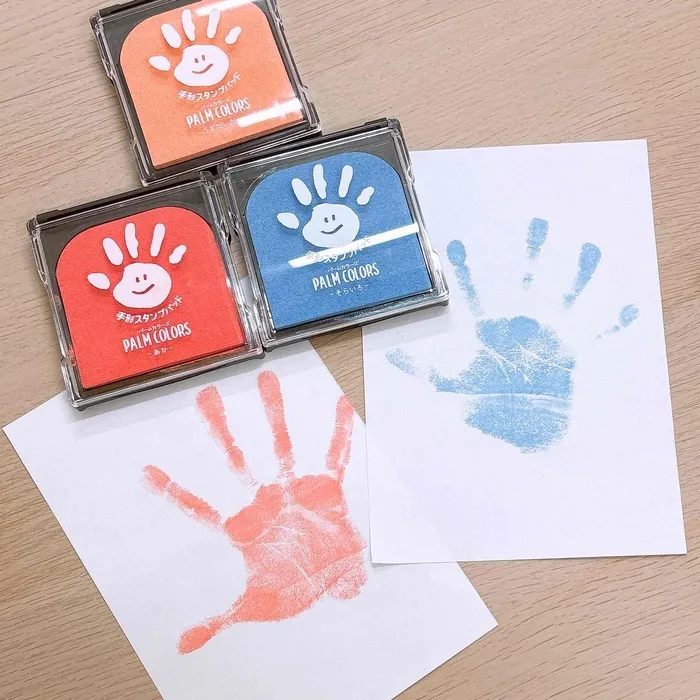 好きな色を選び、スタンプにぎゅぎゅぎゅっと手を押して .. 次に白い紙へ手をペタっと付けます。