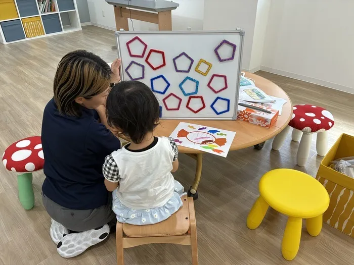 色や形を声に出したり、さわったりすると、想像力、集中力、手先の器用さなどが育まれますね・:*+.\(( °ω° ))/.:+