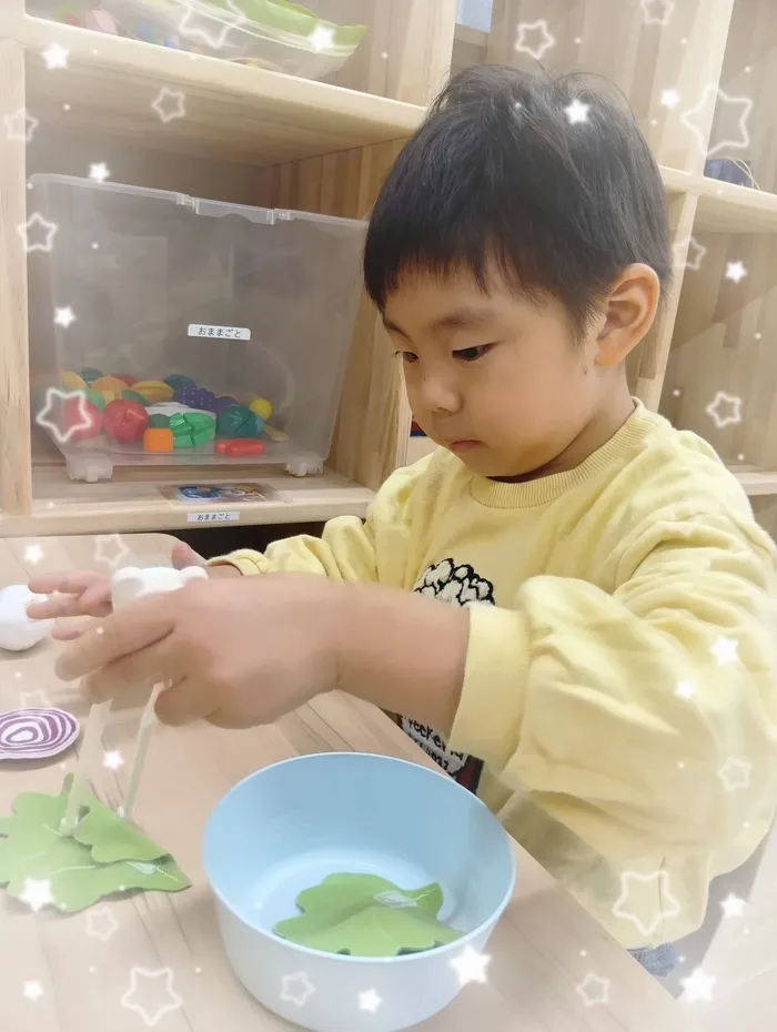 箸だけではなく、ブロックや積み木、粘土やヒモ通し、シール貼りなど手先をたくさん使う遊びを療育で行っております😊
