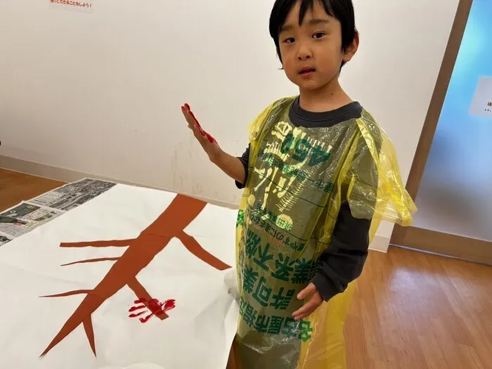 絵の具を手に付けるときに、「感触が気持ちわる―い」などと言いながらもみんな楽しそうな笑顔です♪