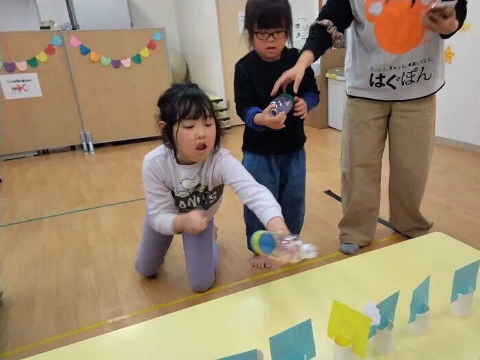 道具も自分たちで作りました。風船をペットボトルにかぶせるのに、みんな苦労していましたが「何としても自分でやりたい子」や「すぐ助けを求める子」、それぞれ試行錯誤しながら完成!