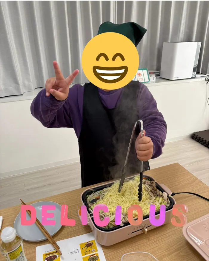 完成した焼きそばを見て達成感いっぱいの表情😊