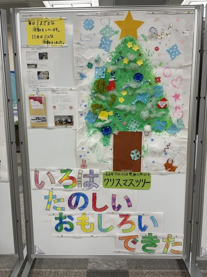 11月の壁面工作のクリスマスツリー制作や、日々の彩葉の様子などを展示いたしました。