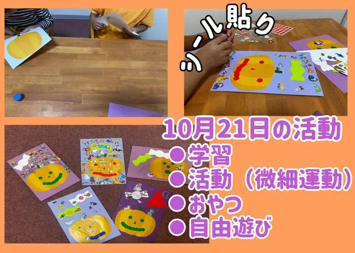 今日はかぼちゃのイラストをハサミで切って〇シール使って顔を作ったりかわいいシールでデコレーションをしました🎃🌟