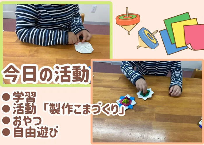 今日は微細運動で折り紙を使ってこまの製作を行いました!