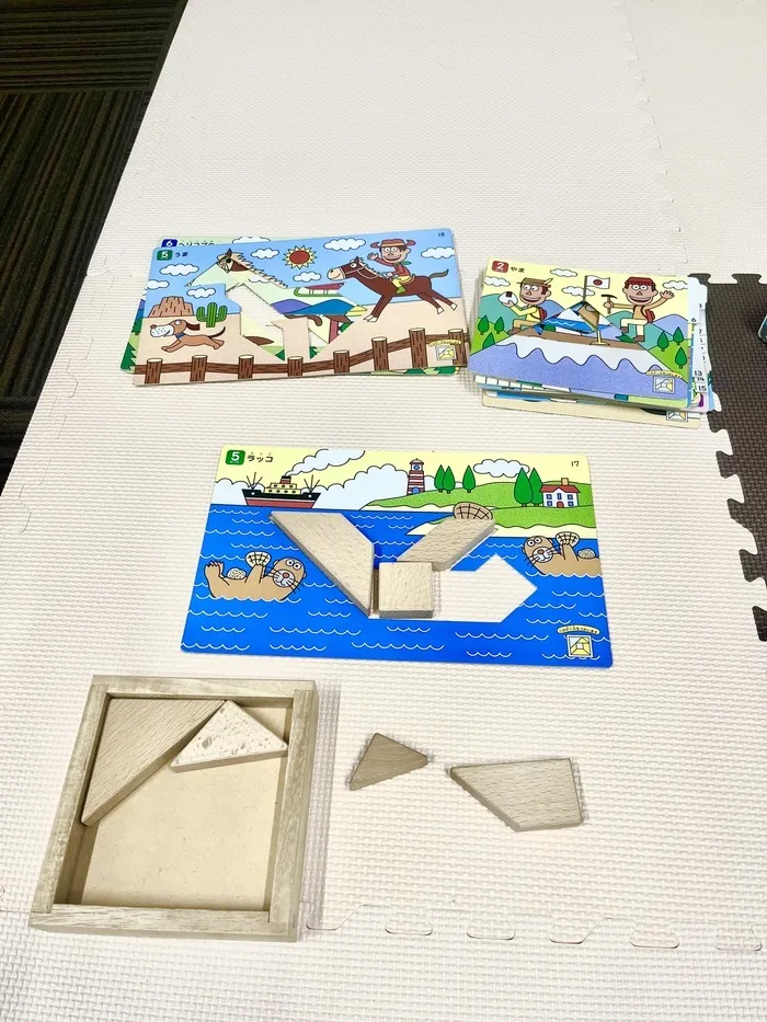 形を組み合わせて完成させる遊びの中で、空間認識力や考える力がぐんぐん育ちます😊