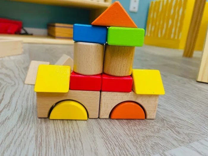 こちらのカラフルな積み木の作品は、自由あそびの時間に子どもが自分で考えて作ったものです。
