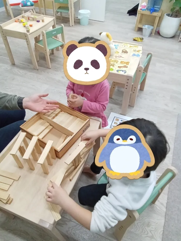 お写真は同年齢同士でしたが、仲良く二人でカプラという木のおもちゃを使ってお家を作っている写真です。