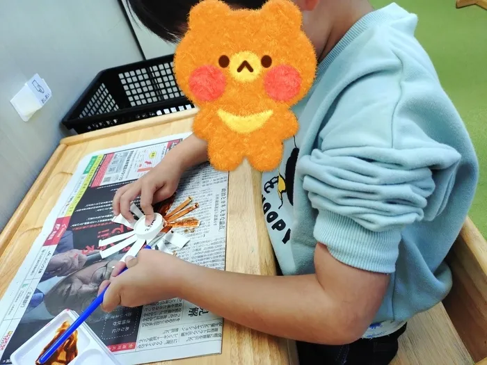 年長さんの作品では、紙コップをはさみで切り絵の具で色を付けています😃