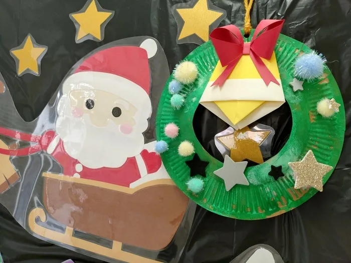 玄関の壁面にお子様製作のかわいいリースがひとつできあがりました😍