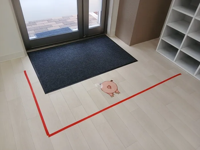 「ここにすわってね」という目印で、初めて来るお子さまでも、靴を脱ぐ場所がすぐにわかるようになっています。