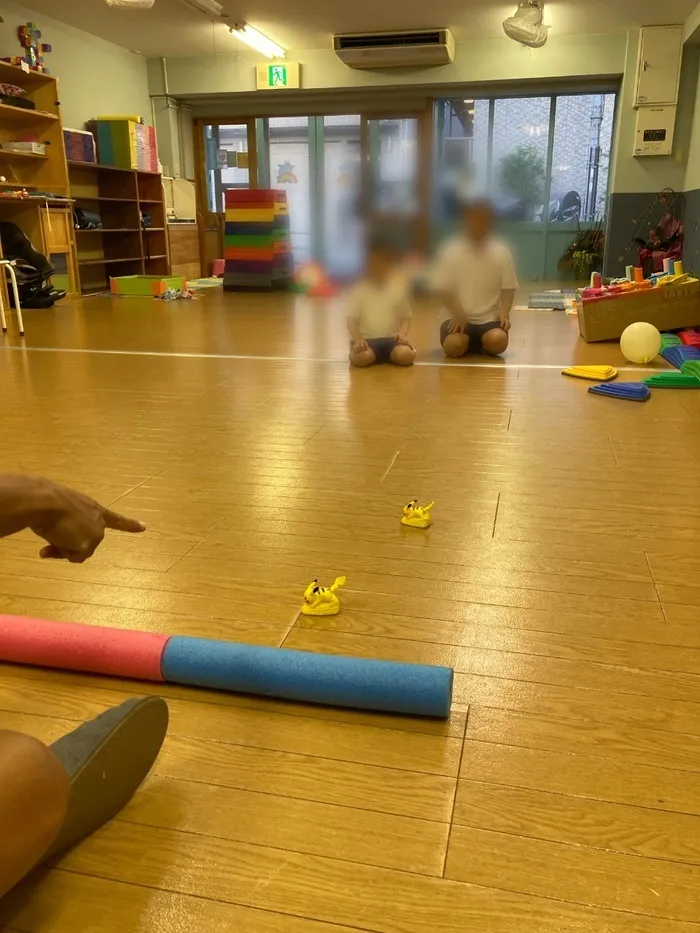 写真はピカチュウギリギリチャレンジ!どちらがプールスティックの近くまでピカチュウを滑らせられるかです!!
