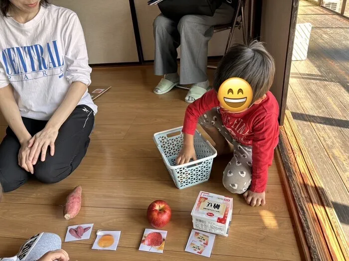 それぞれのペースでお店屋さんとのやり取りを楽しんだ後は、お買い物を発展させて、お買い物リストを覚えておいて、実際にその品物を選ぶ経験をしました。