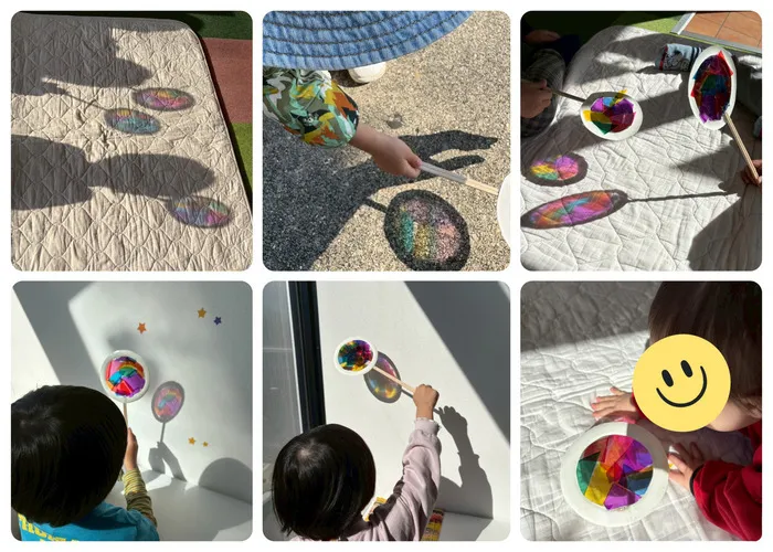 光にかざすと、重なった色が混ざり、壁や床に 虹色の影 が広がります🌈