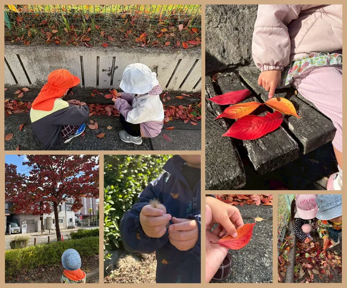 色とりどりの葉っぱを拾いながら、「赤いね!」「ツルツルしてるよ」と、形や色の違いにも自然と気づく子どもたち。