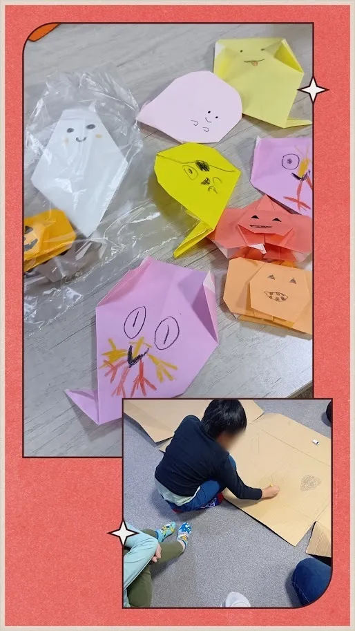 まずはみんなで折り紙を使ってオバケやジャックオーランタンを一生懸命折り、色とりどりの作品が作りました♪👻🎃