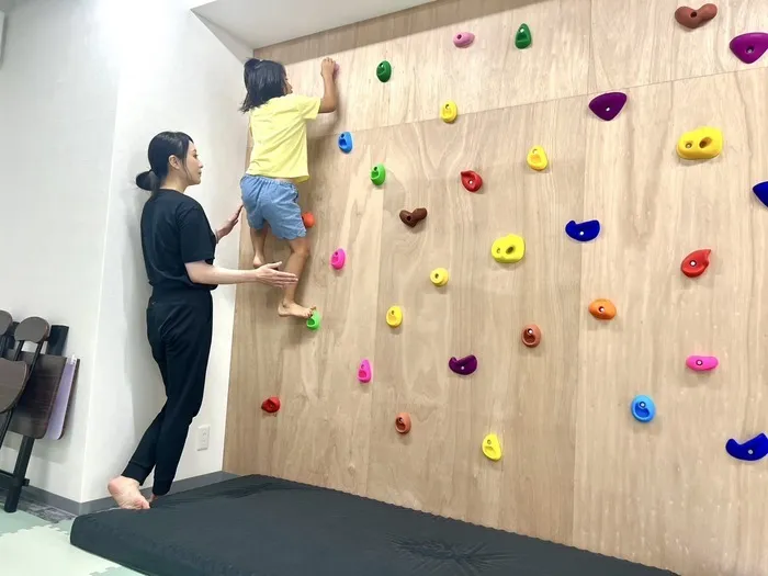 壁に取り付けられたカラフルなホールドを手や足でつかみ、少しずつ体を上へと持ち上げていきます🧗♀️
