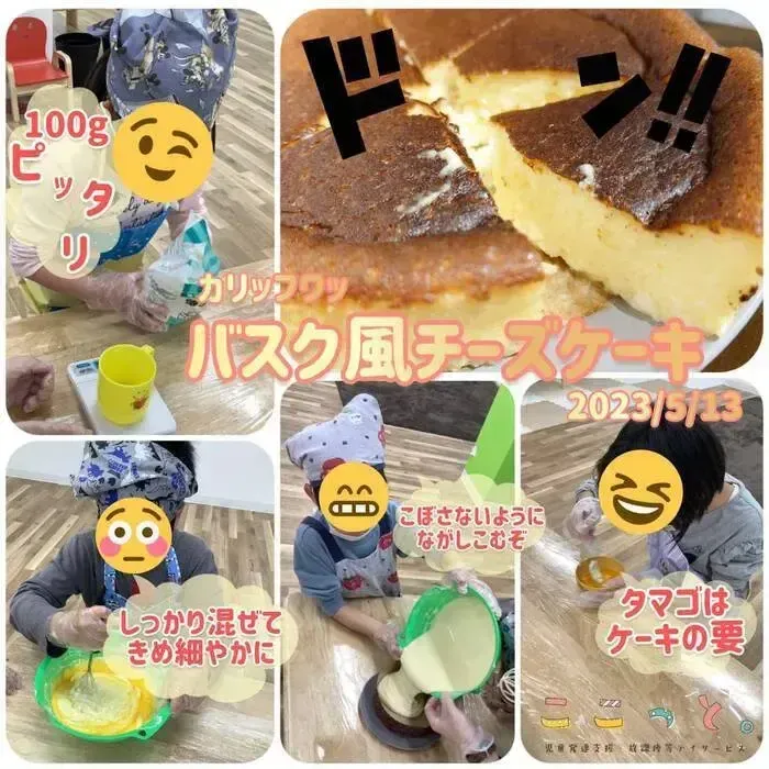 今回はバスク風チーズケーキという海外のおやつを作りましたが、他にもお昼ご飯のクッキングに「世界の料理シリーズ」など、日本、世界を問わず様々な料理やお菓子作りを企画しております💪
