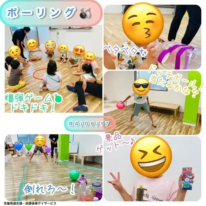 最も嬉しかったのは、ボールの大きさを変えて、運動が苦手な子、小さな子も倒せるように工夫したところ、たくさんのピンを倒してくれました。チームに貢献する喜びを少しは感じてくれたかな💮