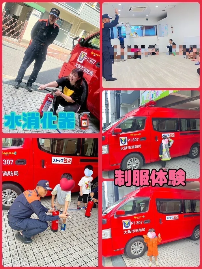 14時からは鶴見消防署の職員さんがきてくれて、火事の際の避難の方法だったり、消化器(水消化器)の使い方も教えてくれたみたいです✨