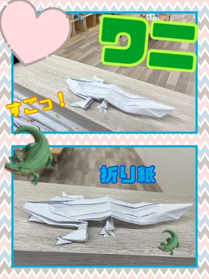 今日は折り紙が得意なこうへい先生がわにを作ってくれました✨