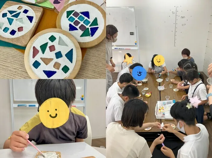 タイルの目地材が乾き、しっかり磨くと、みんな、「めっちゃ きれいにできてるー!!」っと、完成品に満足そうな様子😊敬老の日のプレゼントにするためにメッセージカードを書いて、ラッピングをして、早くおうちの人に見せたーい❣と、うきうきで持ち帰ってくれました🍀