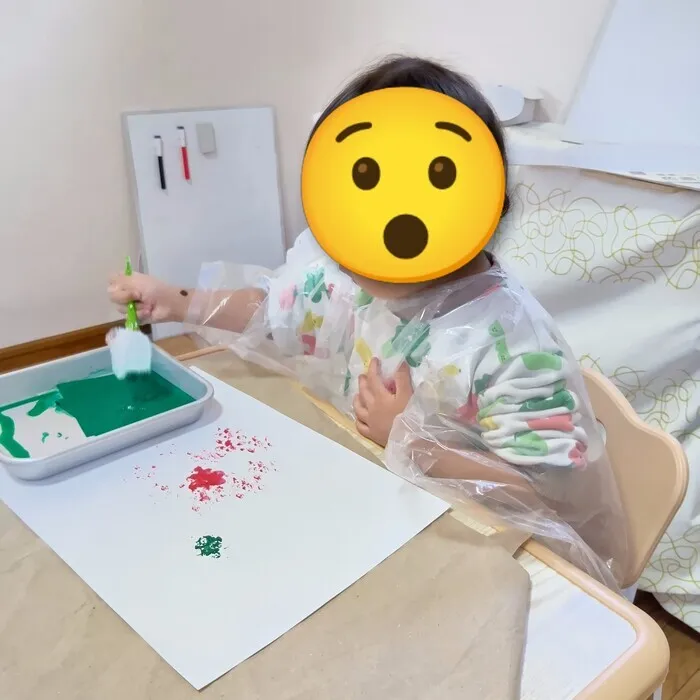 エアパッキンを使ったタンポを赤、緑、黄色の絵の具で押しました☺️