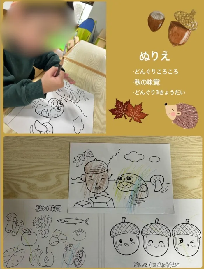 その他にも「秋の味覚」や「どんぐり兄弟」の塗り絵にも挑戦し、好きな色を選びながら、集中しながら取り組んでいました💪
