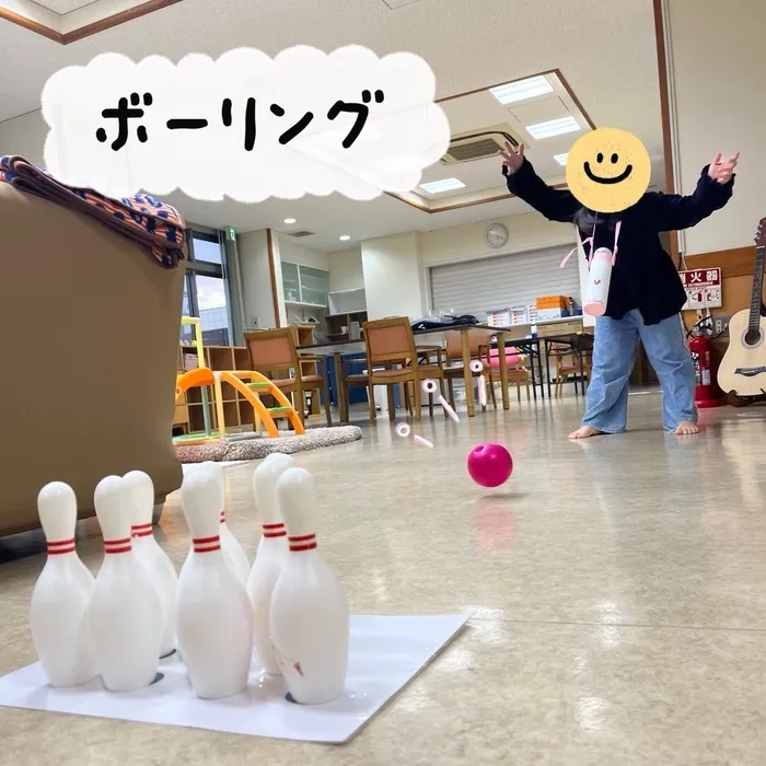 はじめは自信がなさそうに投げていたAちゃんでしたが、一投目にうまく倒すことができると「イエーイ」ととても嬉しそうで、自信がついた様子でした♪