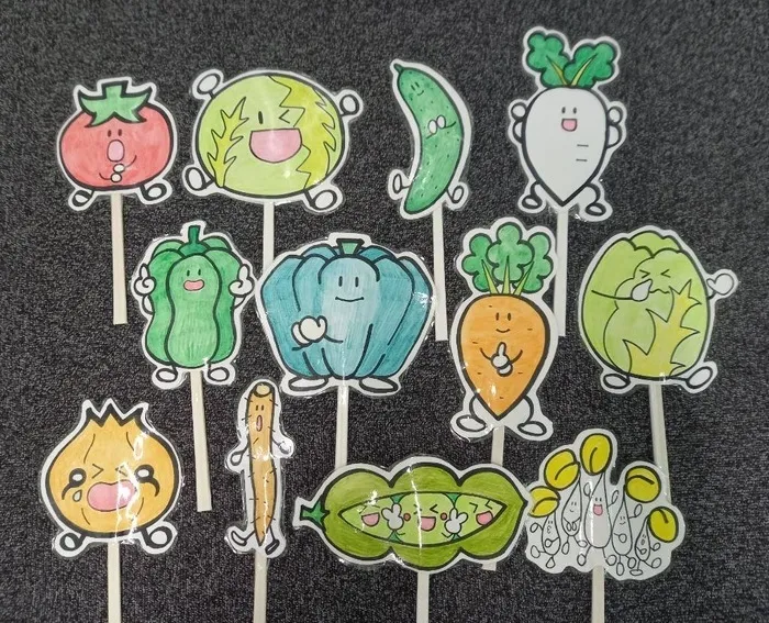 こちらのペープサートは東大前にいるスタッフが手作りしたもので、手遊び(やさいのうた♪)にでてくるやさいたちです。表裏があることで、「これ、な~んだ?!」とお子様に問いかけながら、くるんっと返すのも視覚的に面白いですよね。名詞の理解につながります。