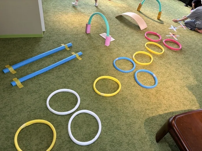 気温が高く、外に出て遊べなかった夏は室内でも体を大きく、たくさん動かせるようにトンネルやけんけんぱを使ったサーキットコースができたり、ふわふわフェルトでできた雪玉で雪合戦をしたり。
