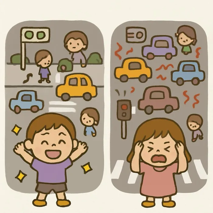 「感覚入力には交通整理が大切です」と聞くと、少し難しく感じるかもしれませんが、これはとても大事なことです。感覚は脳を育てるための栄養のようなもので、いろんな感覚を感じることは脳の成長に役立ちます。でも、たくさんの感覚があるからといって、全部を同時に感じると大変です。そこで「交通整理」が必要になります。