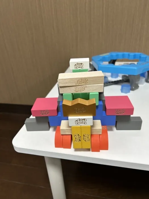 体験に来たお友だちが、ジェンガでブロックの上級者100通りの見本カードの中に入っていない形を作ってしまったよ👏👏