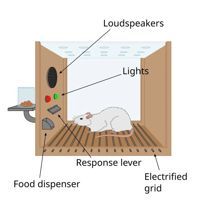 スキナー箱といわれる箱があり、ブザーが鳴りレバーを押すと餌が出る仕組みになっています。