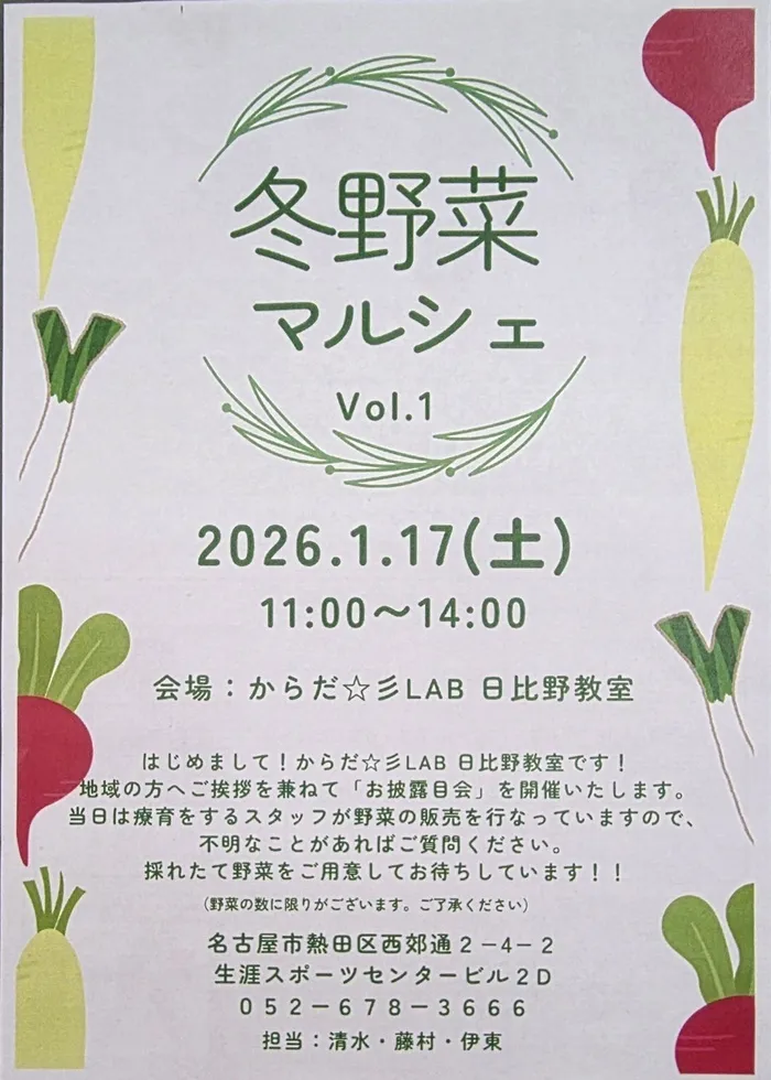 こんにちは! 2026年1月オープンの「からだ☆彡LAB 日比野教室」の清水です。