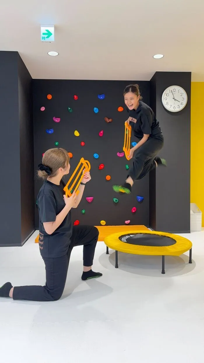 ご家庭でできる運動は、保護者様とお子様で向かい合って両手を繋ぎ小さい段差からジャンプして着地することや、トランポリンなどがあります🎵