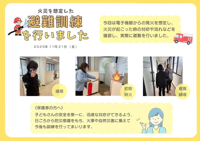 11月21日、スタッフのみで火災を想定した避難訓練を行いました。
