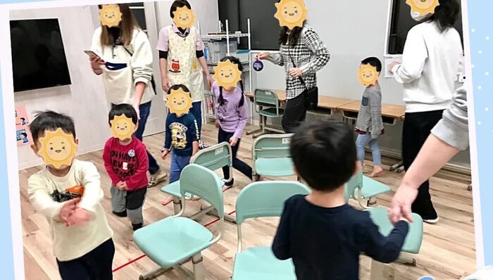 丸く並べたイスの周りを音楽に合わせて回り、音楽が止まったら近くにあるイスに座ります!