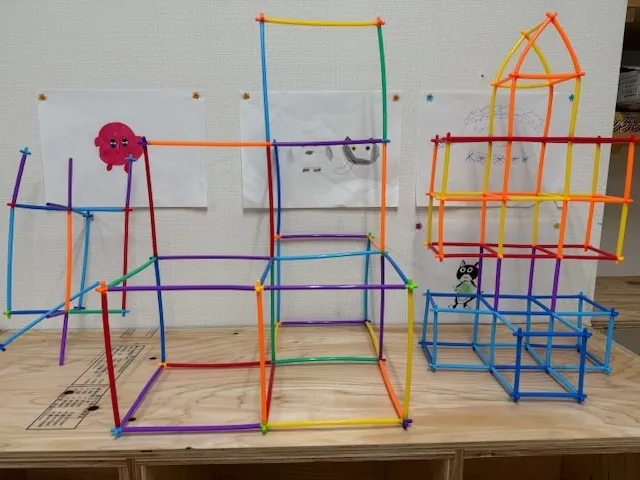 この日は、「ロンビー」を使って、夢中で自分が思い描いた物を作りました。一つひとつの棒を丁寧に使い、一生懸命組み立てました。みんなとても楽しみながら取り組みました。それぞれの作品に、利用者の方の個性がでます。支援員もそんな姿を見て、みんな笑顔になりました。