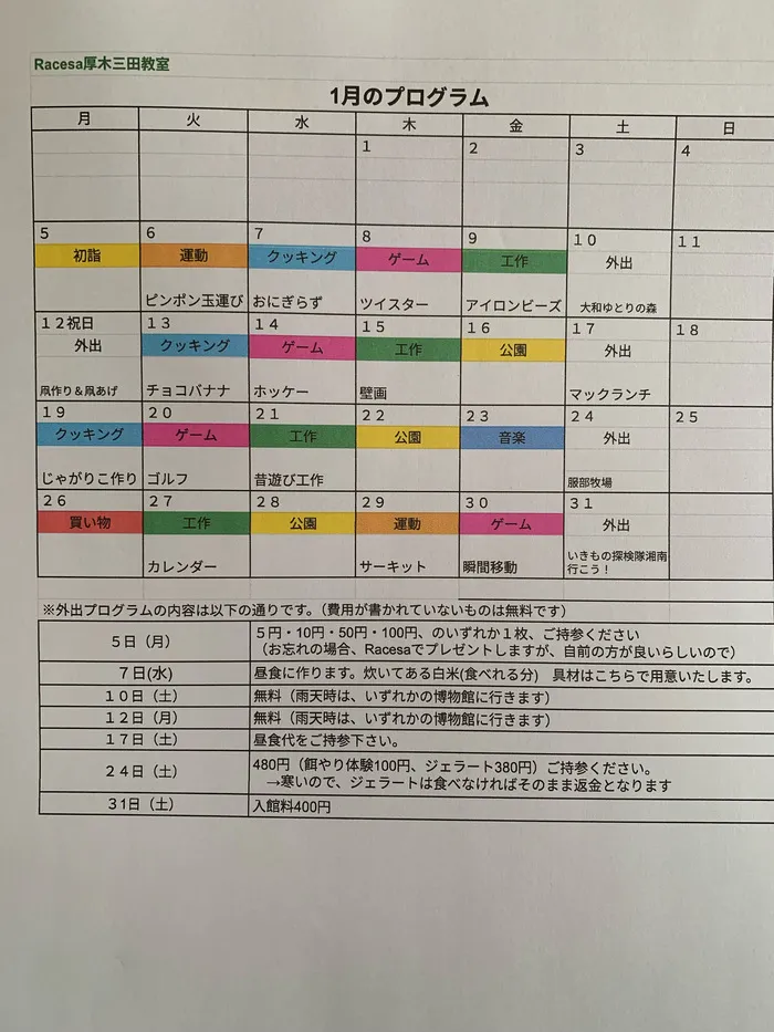 →毎月、事前にプログラム表をお配りしますので、お子様・保護者とも、プログラム内容を事前に知ることができます。中には、プログラムを見て、追加で利用する保護者様もいらっしゃいます。