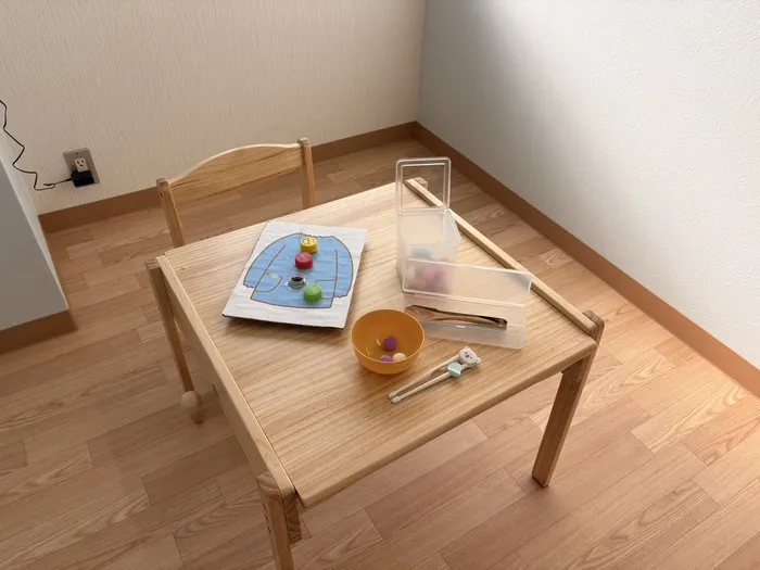 たとえば、ボタンやチャック付きの服を一人で着ることが難しいお子さまとの個別療育としては…。
