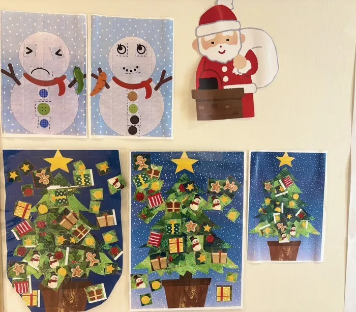 クリスマスツリーの工作では、台紙にそれぞれが飾りたい飾りを切って貼りました。