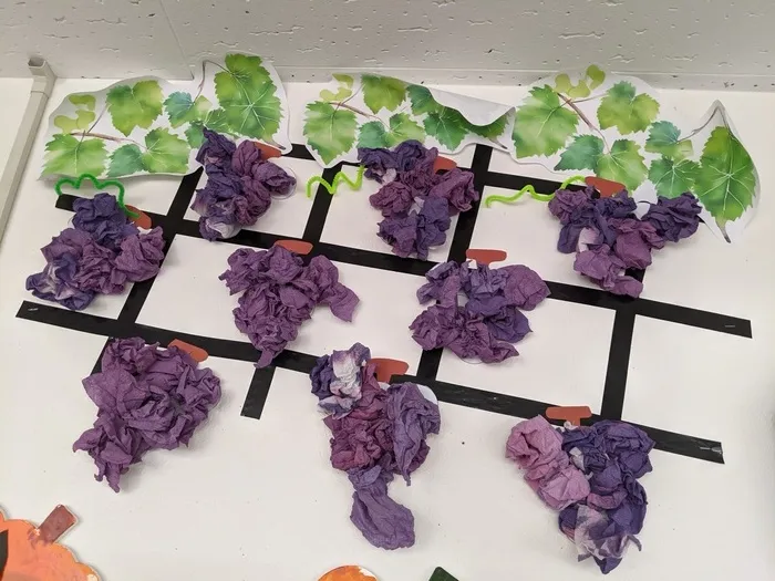 葉っぱをつけたり、ビニールテープで作ったぶどう棚にかざると