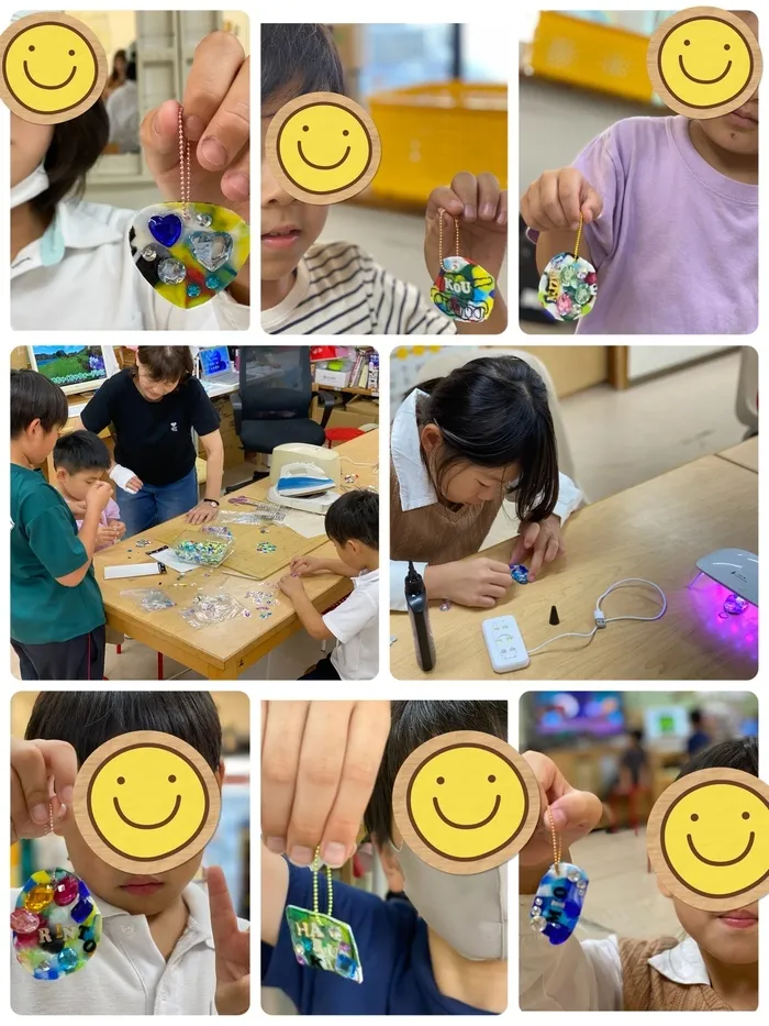 アイロンかけて平に出来たホルダーを好きな形に切ってネームや飾りを入れて最後にレジンで固めました。