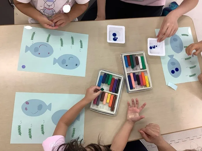この日は魚のプリントをお渡しし、クレヨンで魚に顔を書いてもらいました✍
