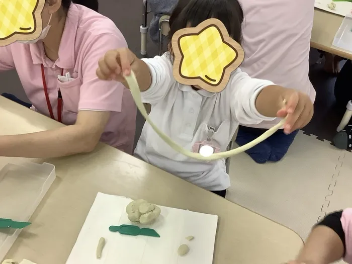 また、粘土用のナイフや型抜きなどの道具も、あえて少なめに準備しておき、「貸して~」「ちょっと待ってね」などやり取りを促しながら遊んでもらいます✨