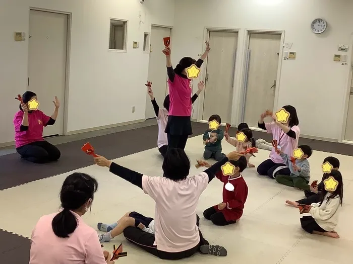 先生の動きを真似っこしたり、鳴子やカエルの形のギロ、しゃぼん玉など新鮮な道具にお子さんたちも大盛り上がりでした☺