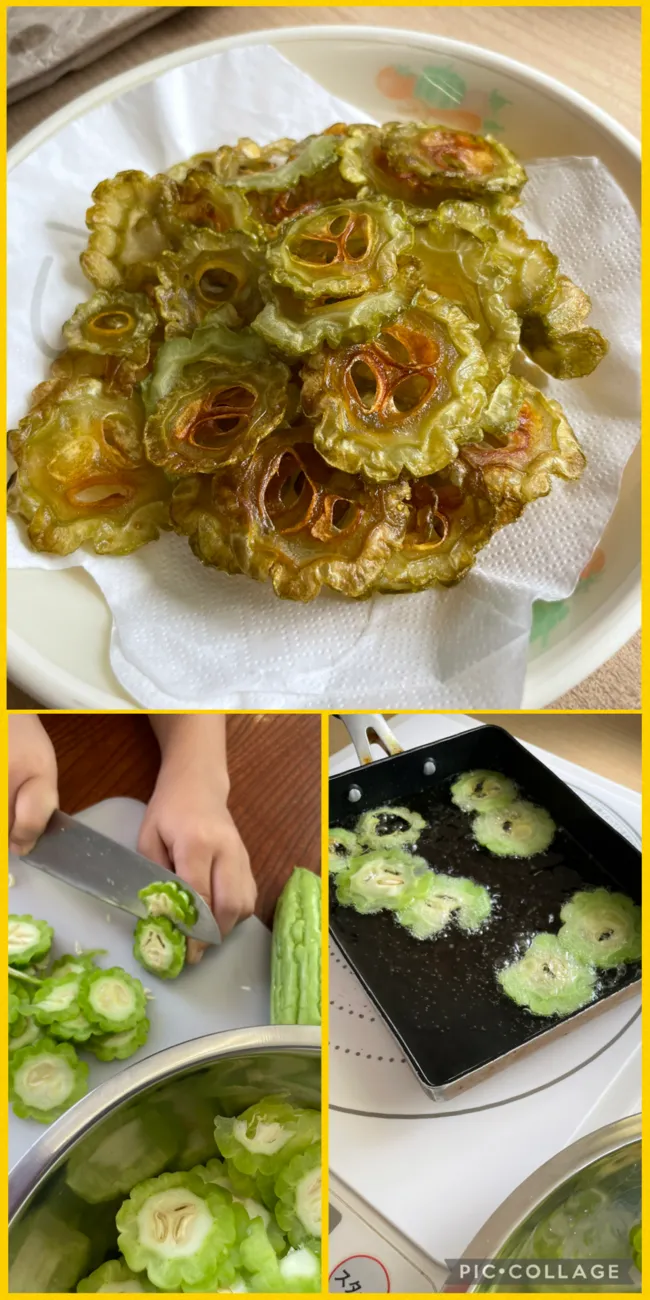 5才の男の子にゴーヤを薄く切ってもらいました。指を切り落としちゃいそうでヒヤヒヤ(;・∀・)塩もみして油で揚げます。とってもおいしくできました(*´ω`)