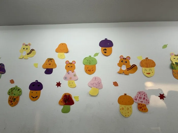 子どもたちは、どんぐりやきのこに絵を描いたり、シールを貼ったりしながら楽しそうに制作に参加してくれました。