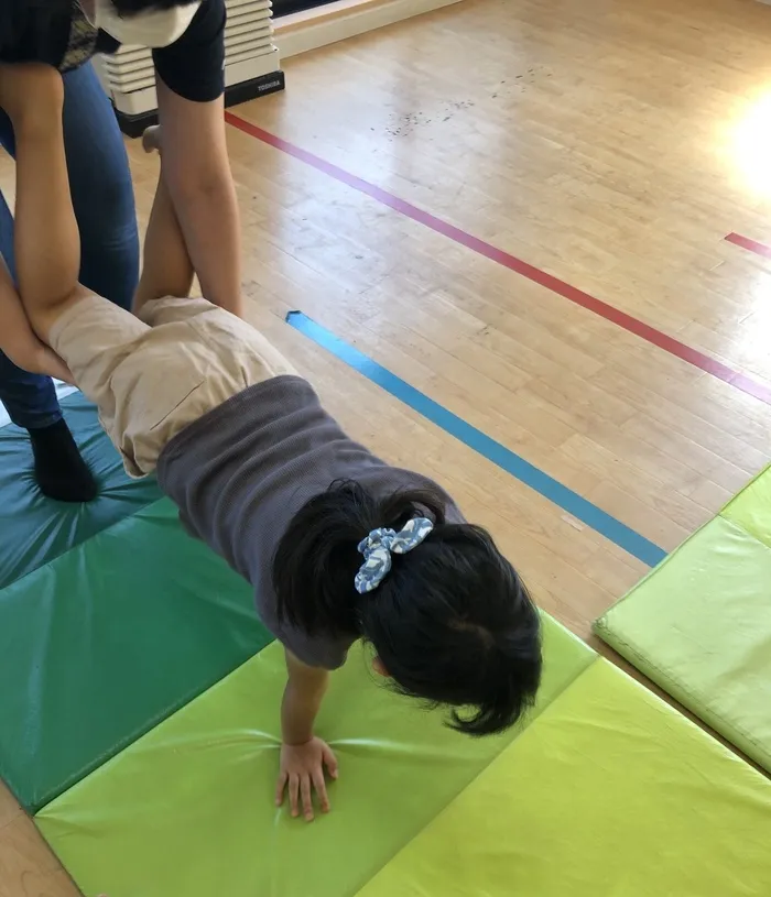 足首を持つのではなく膝上を支えることで腕への負担を減らし段階的に挑戦しています。